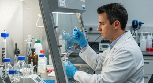 A man in a lab coat working in a laboratory with various equipment and bottles.