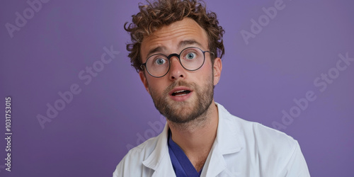 A man in glasses and a lab coat stands before a purple background