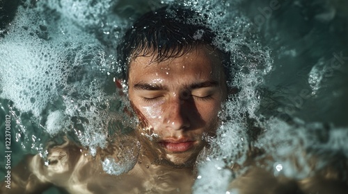 A man is swimming in a pool with his head under the water. The water is foamy and the man is looking at the camera