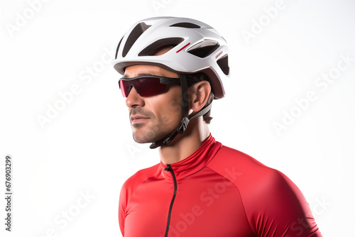 A man is wearing a red bicycle jersey and sunglasses.