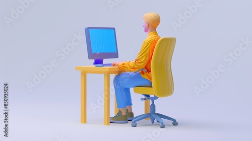 A man is working sitting at a desk in front of a computer monitor. Programmer, trader, designer or other specialist at work. He is focused on his work. Illustration for varied design.