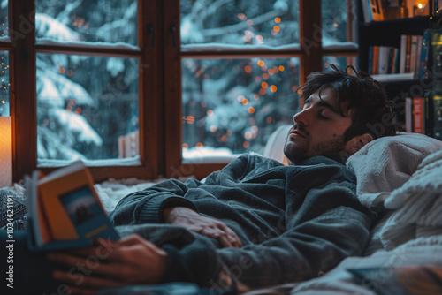 A man relaxes on a couch with a book in hand, gazing out at the snowy landscape through a window. The warm indoor lighting contrasts with the cold outside.