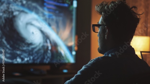 A man, silhouetted against a large screen, watches a swirling hurricane displayed on a monitor, emphasizing the powerful force of nature.