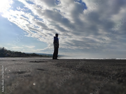 A man stands on the edge of a black sand beach, facing the ocean with a dramatic sky filled with clouds in the background. This image conveys a sense of tranquility, self-reflection