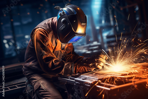 A man welder in brown uniform, welding mask, weld metal construction site. AI Generated