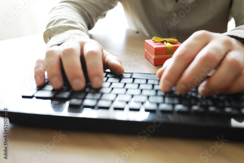 A man with a gift in his hand sits in front of the monitor screen. Order a gift for home and office.