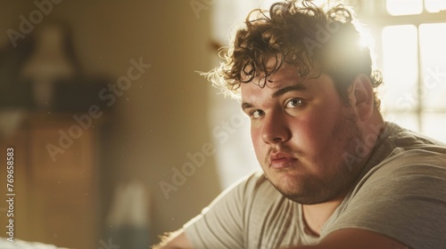 A man with curly hair wearing a gray shirt sitting in a room with a lamp and a window looking slightly to the side with a thoughtful expression.