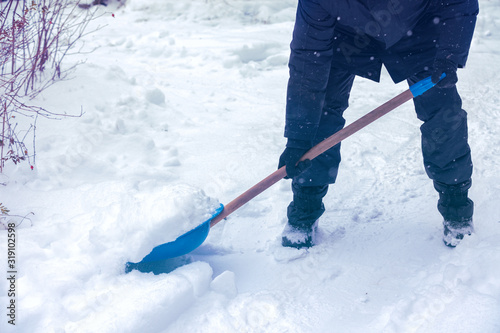 A man with snow shovel cleans a road in winter. The man shoveling the snow after snowfall