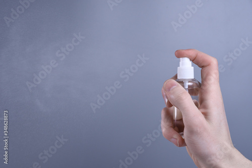 A man's hand holds and snaps a disinfectant spray to disinfect various surfaces that people touch.antibacterial antiseptic gel for hands