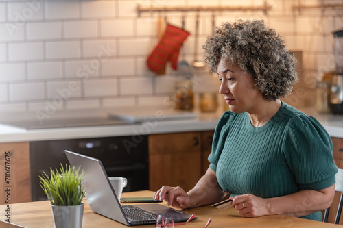 A mature woman of mixed race is making an online purchase or payment, utilizing a credit card and a laptop computer. Online banking concept