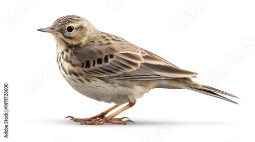 A Meadow Pipit with slender build and brown streaked plumage, perched centrally on a white background, detailed beak and feathers, studio-lit, photorealistic image