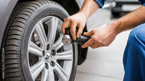 A mechanic works diligently with an impact screwdriver on a silver aluminum wheel, ensuring proper maintenance in a garage workshop
