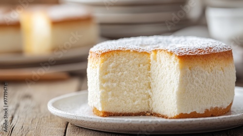 A medium-sized cheesecake, beautifully risen and dusted with powdered sugar, showcased on a white plate, presenting a homey and inviting vibe, perfect for dessert lovers.