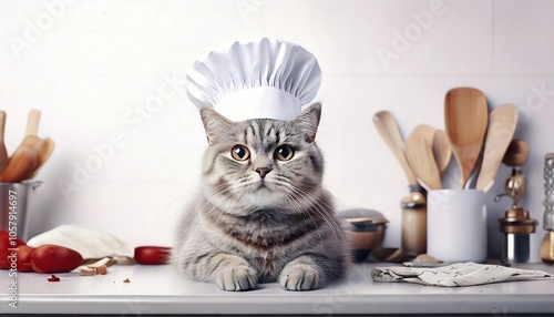 A meme cat wearing a chef's hat, sitting on a kitchen counter with simple, clean kitchen too