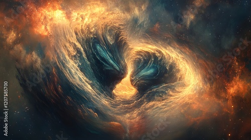 A Mesmerizing Digital Artwork of Two Black Holes Colliding, Radiating Gravitational Waves Amid a Mystical Starry Nebula