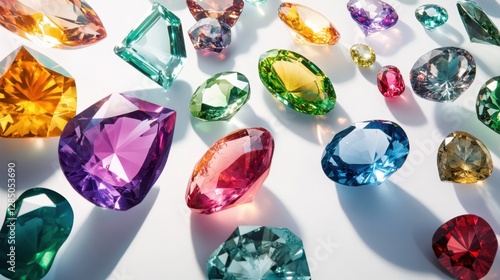A mesmerizing display of faceted gemstones, including sapphires, emeralds, and rubies, radiating a prismatic glow against a clean white background.