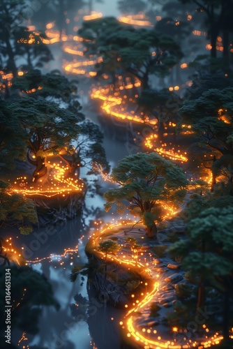 A mesmerizing landscape with a winding river illuminated by glowing lights, surrounded by lush trees and serene waters.