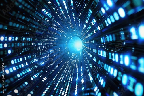 A mesmerizing tunnel created by multiple blue lights in a dark room, Binary code transitioning into a digital fortress, AI Generated