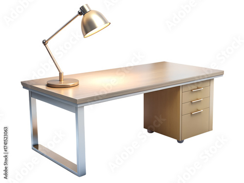 A metal desk with a drawer unit and an adjustable desk lamp, isolated on transparent background