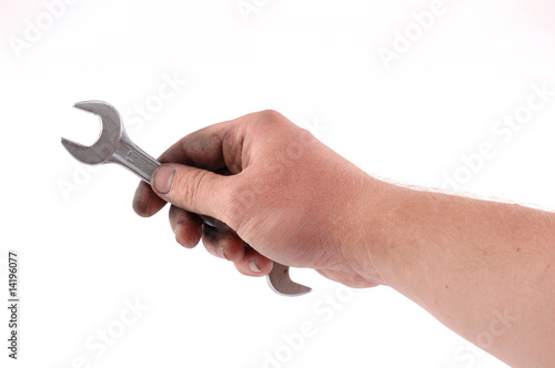 a metallic wrench is in a hand