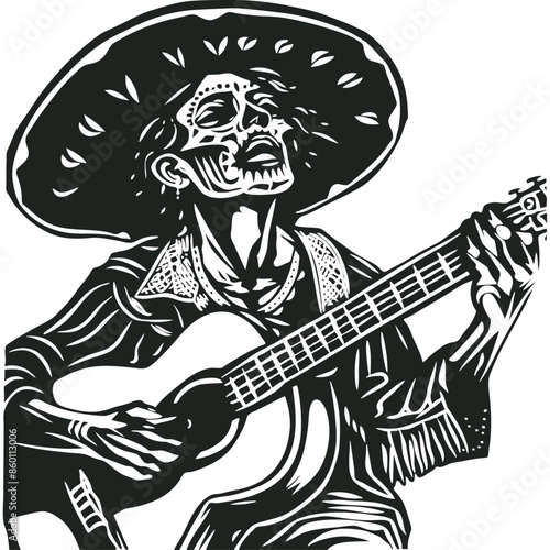 A Mexican man in a sombrero and Day of the Dead makeup plays the guitar. vector