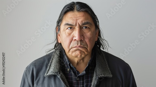 A middle-aged or elderly man with long. dark and slightly graying hair wearing a dark jacket with a gray fuzzy collar and a blue plaid shirt underneath.