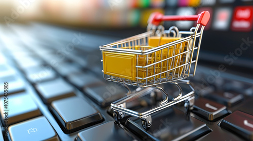 A miniature shopping cart is positioned on a laptop keyboard, symbolizing the growing trend of online shopping and digital commerce in today's world