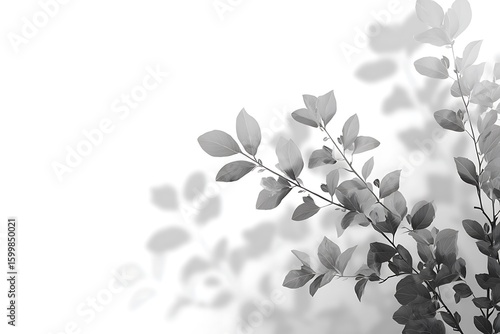 A minimalist black and white composition showing delicate tree branches with leaves casting soft gray shadows on a pristine white background, creating a serene and natural abstract pattern.