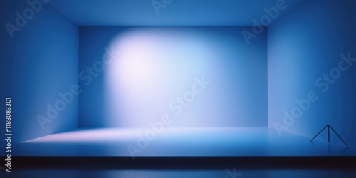 A Minimalist Blue Room with a Single Light Source and a Tripod on the Floor