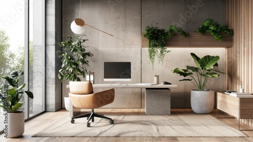 A minimalist home office emphasizes simplicity and functionality, featuring a limited color palette, sparse furniture, and a serene, uncluttered ambiance.