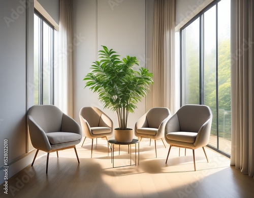 a minimalist interior scene featuring four modern upholstered chairs and a lush green plant illuminated by natural light streaming through the windows