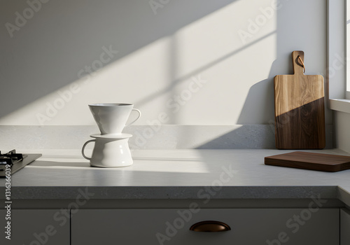 A minimalist kitchen counter with a single ceramic pour-over coffee maker.