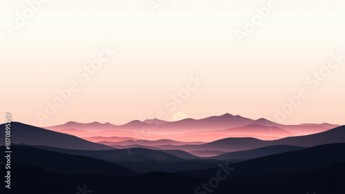 A minimalist landscape with distant mountain silhouettes under a pale gradient sky at dawn, using simple shapes and soft hues.