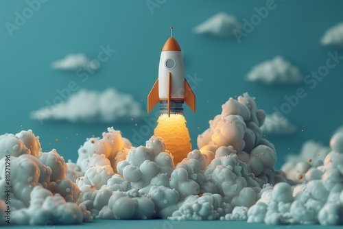 A minimalist rocket launch with a strong, blue background conveys creativity and the start of a new venture in a simple, clean style