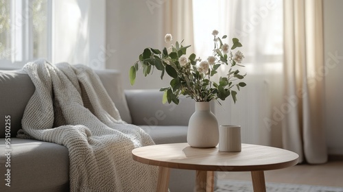 A minimalist Scandinavian living room with a wide gray sofa draped in cozy blankets, a wooden coffee table with a vase of flowers in the center, and clean, neutral decor.