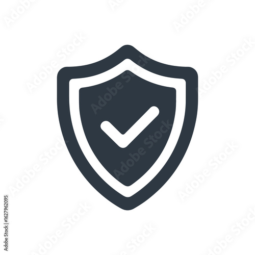 A minimalist shield icon with a checkmark displayed on a white background, concept for security solutions, data protection, and warranty assurance