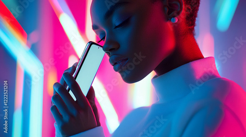 A model advertising a sleek smartphone, holding it near their face, showcasing a bright screen, with a futuristic neon-lit background.