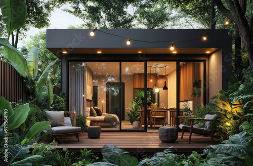 A modern and cozy home garden with a wooden deck, green plants, hanging string lights, a sliding glass door leading to the living room