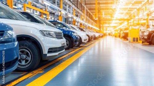 A modern automotive assembly line with various vehicles parked, showcasing industrial design and efficiency, Ideal for use in automotive, manufacturing, or logistics presentations,
