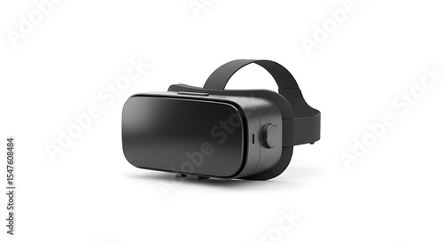 A modern black virtual reality headset with an adjustable strap, isolated on a clean white background. Technology concept.