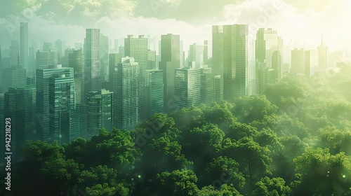 A modern city skyline with high-rise buildings peeking through a thick forest canopy.