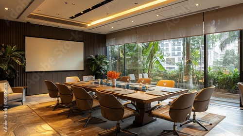 A modern conference room with a large table, comfortable chairs, and a presentation screen