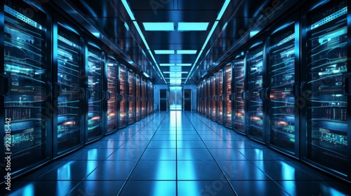 A modern data center with rows of servers illuminated by blue lighting.