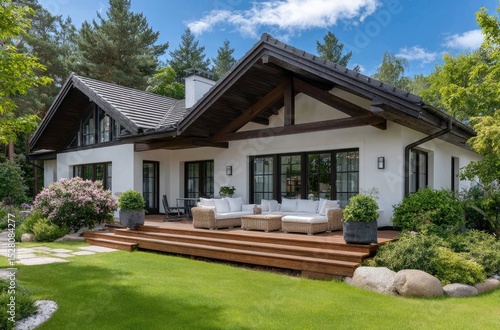 a modern house with white walls and a black roof. On the lawn, there is a wooden terrace and brown wooden steps leading up to it