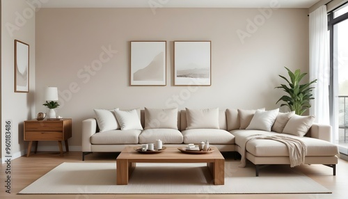 A modern living room with a beige sofa, white throw pillows, and a wooden coffee table. The room has a minimalist and cozy atmosphere.