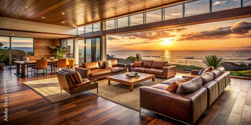 A modern luxury living room with an open floor plan, large windows and flat roof overlooking the ocean at sunset. The furniture is made of leather and wood. Generative AI.