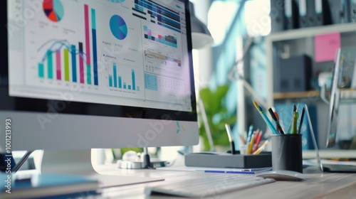 A modern office desk with an iMac displaying colorful charts and graphs, surrounded by office supplies in vibrant natural daylight.