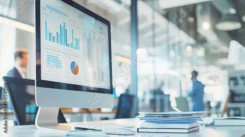 A modern office setting with a focus on a computer displaying graphs and a blurry person in the background, symbolizing analytics. Generative AI