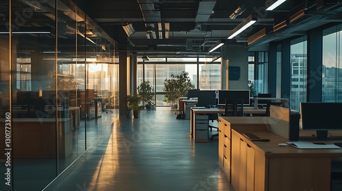 A modern office with advanced screens tracking TQM processes for better work and constant progress. Space for text below.