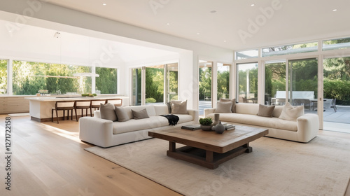 A modern, open-concept living room and kitchen with large windows overlooking a pool and garden, featuring white sofas, a wooden coffee table, and a dining area.